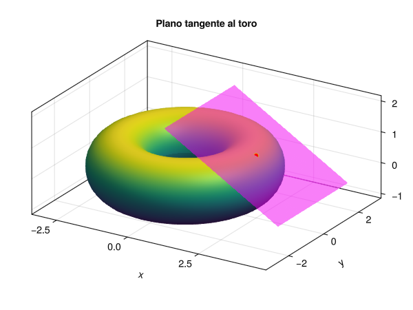 Plano tangente al toro Para calcular la derivada direccional necesitamos primero el gradiente. Calculamos el gradiente de \(z\) usando la función implícita \(F(x,y,z) = 0\):