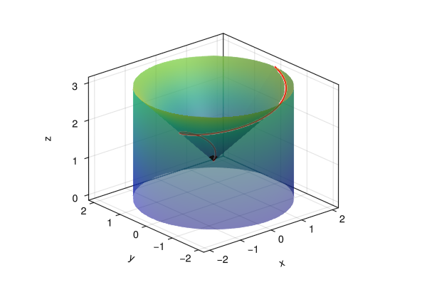Ejercicio 19.6 Un depósito está formado por un cilindro con base el círculo de radio 2 m centrado en el origen y techo el cono de ecuación \(z=1+r\) en coordenadas cilíndricas.