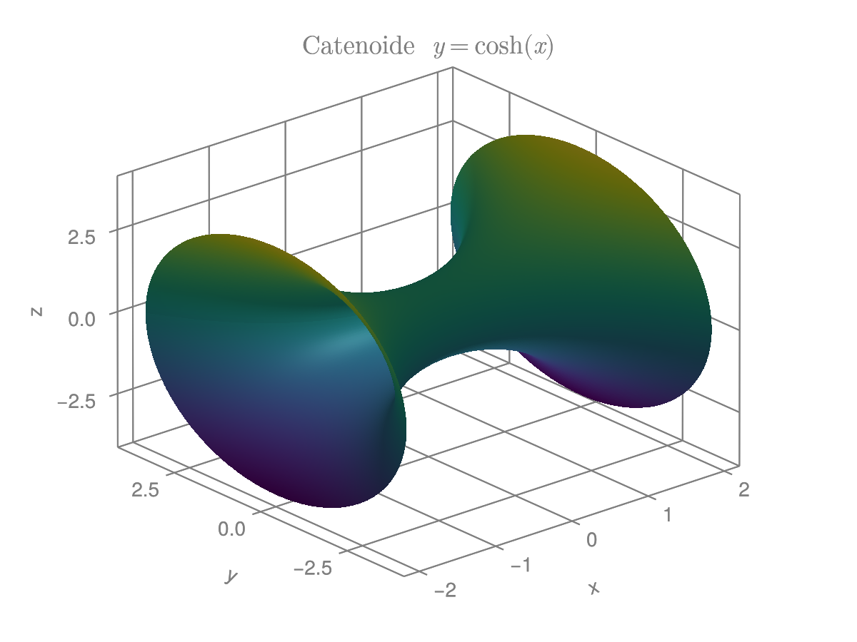 Ejercicio 21.2 Un catenoide es un tipo de superficie que se obtiene al rotar una catenaria alrededor de su directriz. Calcular el área de la superficie que se forma al rotar la curva catenaria dada por la ecuación \(y=a\cosh\left(\frac{x}{a}\right)\) alrededor del eje \(x\) entre \(x=-b\) y \(x=b\), donde \(a\) y \(b\) son constantes positivas.