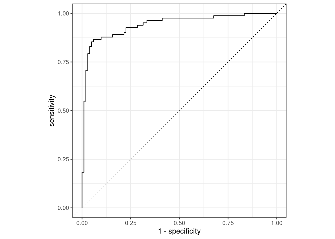 Utilizar la función roc_curve del paquete yardstick para calcular la curva ROC y la función roc_auc para calcular el área bajo la curva (AUC).