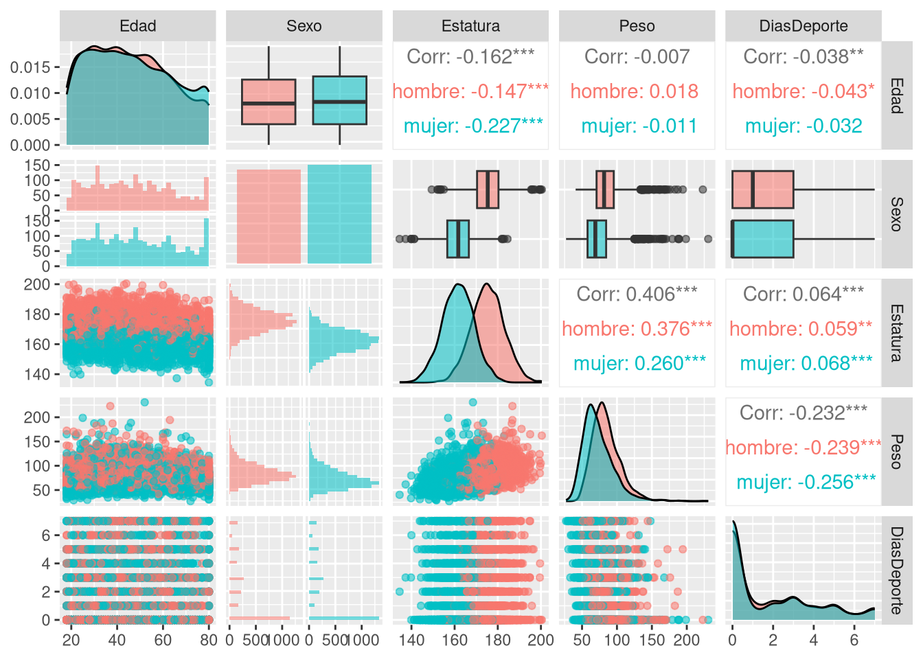Se puede utilizar la función ggpairs del paquete GGally para dibujar un diagrama de relación entre todos los pares de variables del conjunto de datos. Asociar el sexo a la dimensión del color.